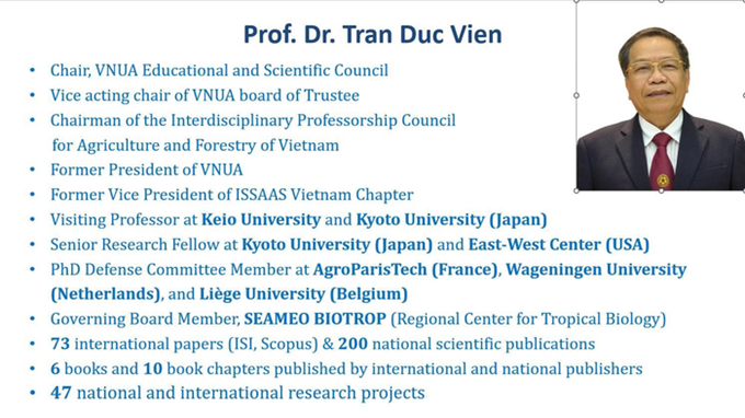 Thầy Trần Đức Viên - nguyên là Hiệu trưởng Trường Đại học Nông nghiệp I, Giám đốc Học viện Nông nghiệp Việt Nam, Chủ tịch Hội đồng Học viện Nông nghiệp Việt Nam; thành viên Ban quản lý của Trung tâm Sinh học Nhiệt đới Đông Nam Á (Seameo Biotrop), Phó Chủ tịch Hiệp hội ISSAAS, giáo sư thỉnh giảng Đại học Kyoto, Đại học Keio (Nhật Bản); nghiên cứu viên cao cấp (Senior Research Fellow) Đại học Kyoto, Trung tâm Nghiên cứu Đông-Tây (East-West Center), Hoa Kỳ; thành viên hội đồng bảo vệ luận án tiến sĩ của Viện công nghệ Nông nghiệp Paris (AgroParisTech), Đại học Waginingen (Hà Lan), Đại học Liege (Vương quốc Bỉ).